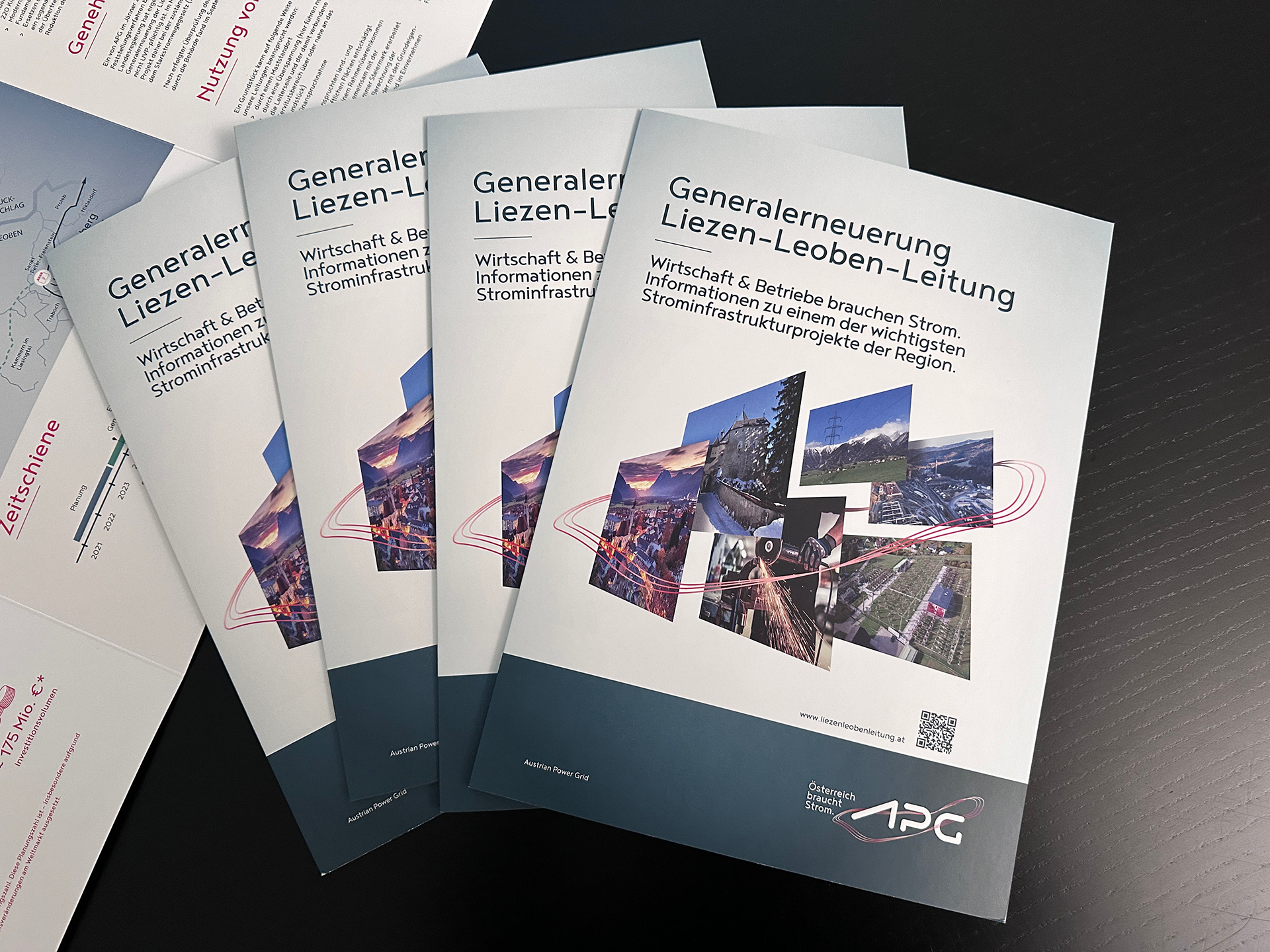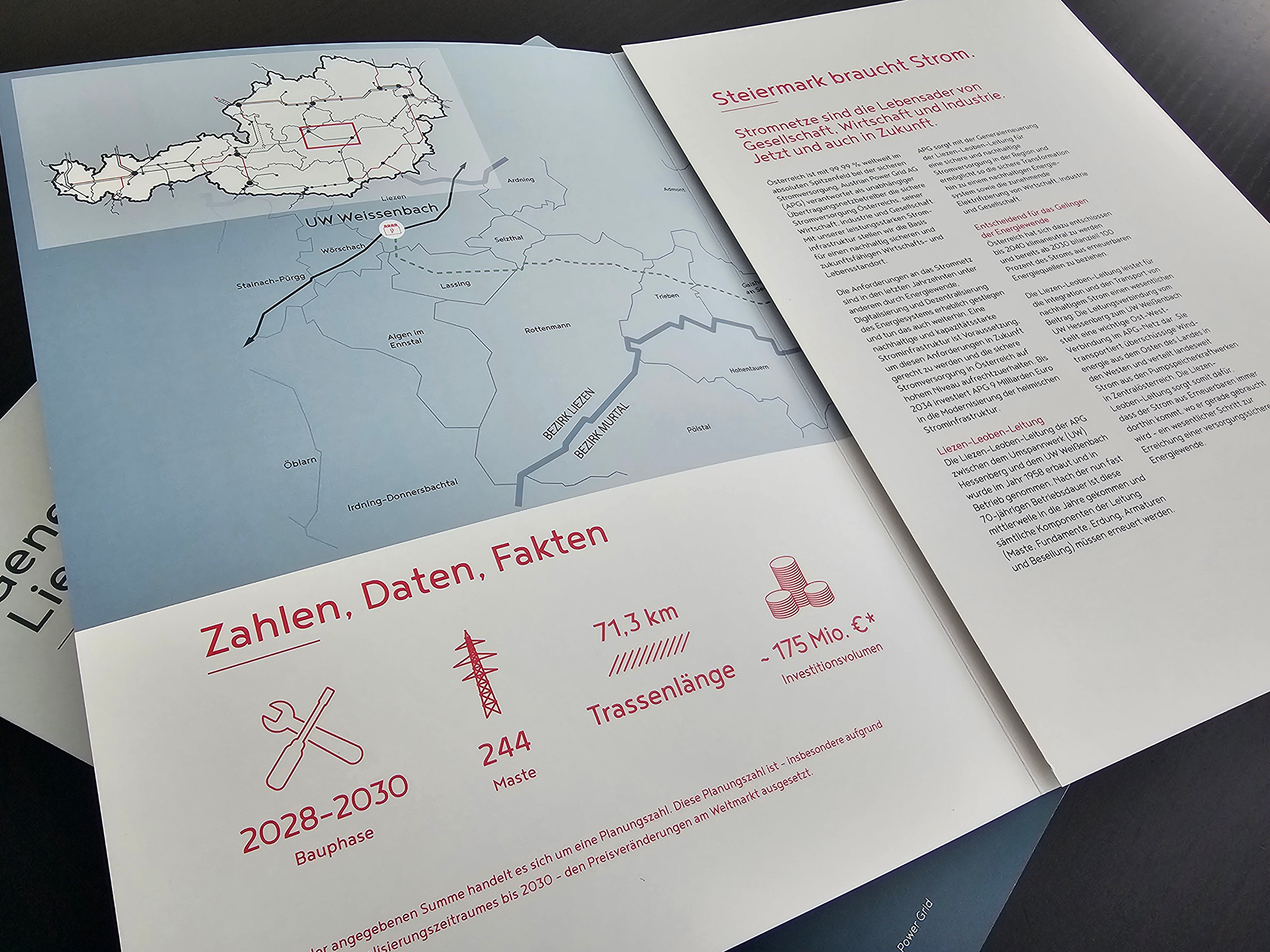 Für die Austrian Power Grid AG (APG) haben wir als Full-Service-Werbeagentur die Informationsmappe zur Generalerneuerung der Liezen–Leoben-Leitung realisiert. Die Mappe ist Teil einer übergeordneten Kommunikationsserie, die in Gestaltung, Tonalität und Symbolik konsequent aus einem Guss entwickelt wurde.