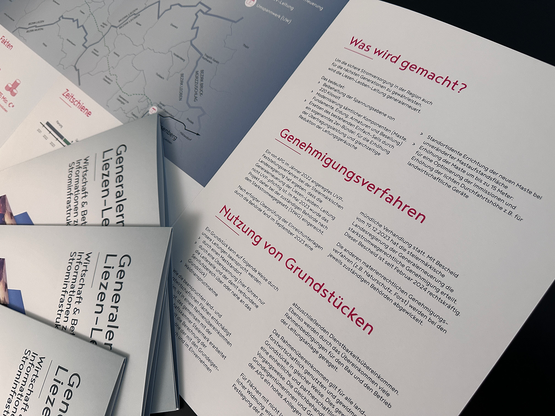 Unsere Aufgabe bestand darin, diese technische, wirtschaftliche und gesellschaftliche Bedeutung klar und verständlich zu kommunizieren. Die Mappe richtet sich an Wirtschaft, Betriebe und die Bevölkerung und vermittelt komplexe Inhalte strukturiert, transparent und visuell hochwertig. Kartenmaterial, Bildwelten und Infografiken wurden so aufbereitet, dass sie Orientierung geben und Vertrauen schaffen.